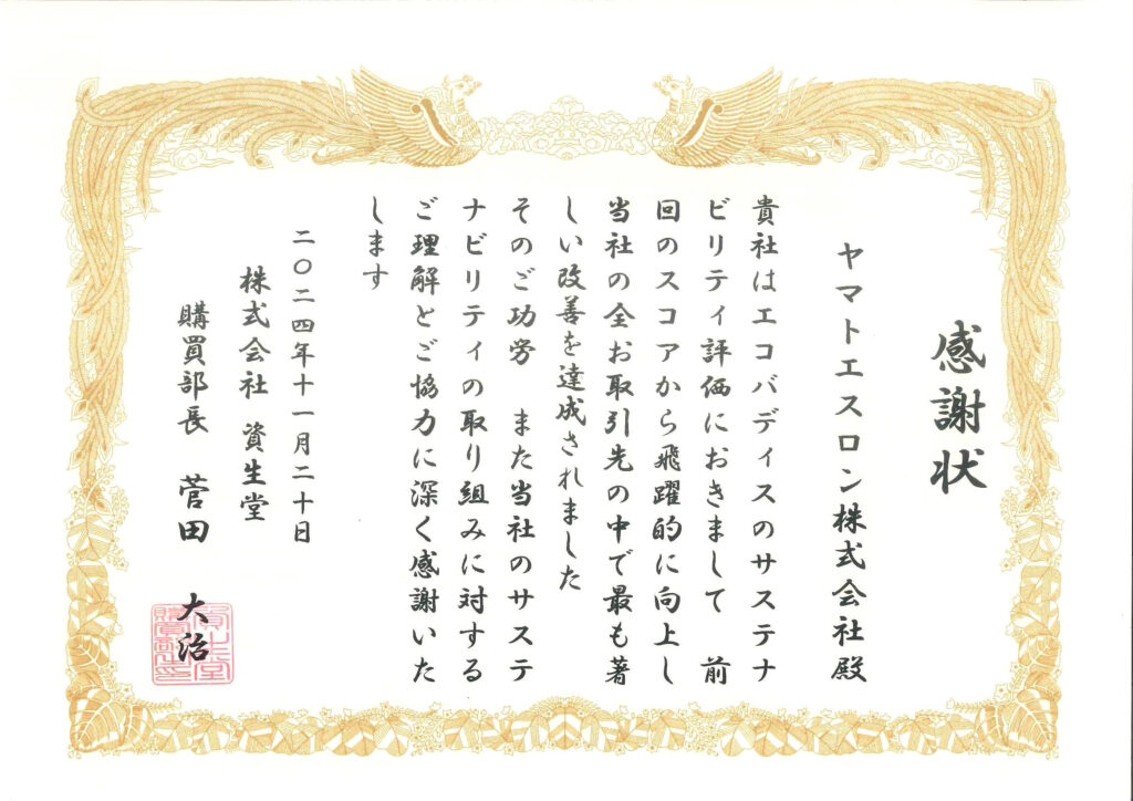 2024年11月20日(水)、ヤマトエスロン株式会社は株式会社資生堂にて開催された購買方針説明会において、Ecovadisのスコアが昨年と比較して伸び率が一番高いサプライヤーとして表彰いただき、パッケージ&OEM部門において1位を獲得いたしました。
